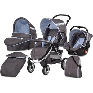 Allroundtalent auf höchstem Niveau. Mit dem Apollo 11 All In One Set von hauck sind Sie von Anfang an komplett ausgestattet! Im Lieferumfang sind neben dem federleichten Aluminiumsportwagen mit leichter Beindecke auch eine Babywanne mit Winddecke, ein Autositz der Gruppe 0+ sowie ein Regenschutz und eine Wickeltasche enthalten. Dieses hochwertige Komplettset unterstützt verantwortungsbewusste Eltern und begleitet Ihr Kind vom 1. Lebenstag bis zum Ende der Kinderwagenzeit. Der Autositz lässt sich auch auf dem Sportwagen befestigen und in Kürze zum praktischen Shop'n Drive-System umwandeln. Damit geht es vom Auto direkt in die Stadt zum Einkaufen, ohne dass Sie Ihr Kind aus der Babyschale nehmen müssen. Für den Fahrkomfort Ihres Kindes sorgen die 3-fach verstellbare Rückenlehne (Ruheposition 153°, Sitzposition 110°) sowie eine bequeme Fußstütze (6-fach verstellbar). Darüber hinaus verfügt der Kinderwagen im modernen Design über eine besonders weiche Federung. Schwenk- und feststellbare Vorderräder garantieren Wendigkeit. Auch für Sie wird bei diesem Modell für Fahrkomfort gesorgt! Mit dem federleichten Aluminium-Gestell überwinden Sie jede Hürde spielend einfach. Das Set hat ein Gewicht von 19,1 kg. Der Schieber des Wagens lässt sich problemlos in der Höhe verstellen (12-fach, 85-111cm) - so passt sich der Kinderwagen optimal Ihrer Größe an und Sie schonen Ihren Rücken. Alle Räder sind aus Kunststoff und leicht zu montieren. Vorn haben sie einen Durchmesser von 20 cm, hinten sind es 25,5 cm. Im geräumigen Einkaufskorb können Sie Ihre Babyutensilien bequem verstauen. Bezug und Verdeck sind abnehmbar und handwaschbar. Das Obermaterial besteht aus 100 % Polyester die Füllung aus 100 % Polyester-Vlies. Aufgebaut hat das Gestell einen Umfang von l 91 cm x b 57 cm x h 111 cm, zusamengeklaptt sind es l 86 cm x b 57 cm x h 42 cm. Ma&s